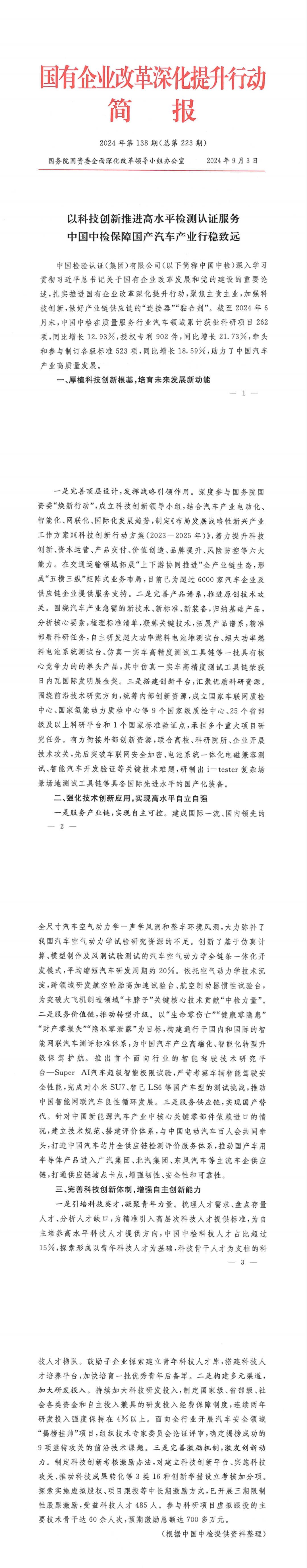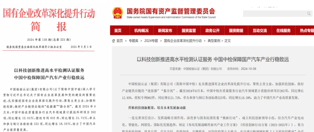 中国汽研参与撰写的《以科技蜕变激动高水平检测认证处事 中国中检保险国产汽车产业行稳致远》稿件在《国有企业更正深化普及四肢简报》(2023年第138期)上刊发,并在国务院国资委官网发布。