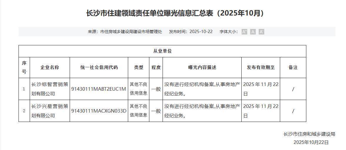 10月22日,长沙市住房和城乡成就局公布了10月住建鸿沟包袱单元曝光信息汇总表,曝光了两家企业凯时体育游戏app平台,分歧为长沙标智营销筹办有限公司、长沙兴星营销筹办有限公司。两家公司均在莫得进行经纪机构备案的情况下,从事房地产经纪业务。