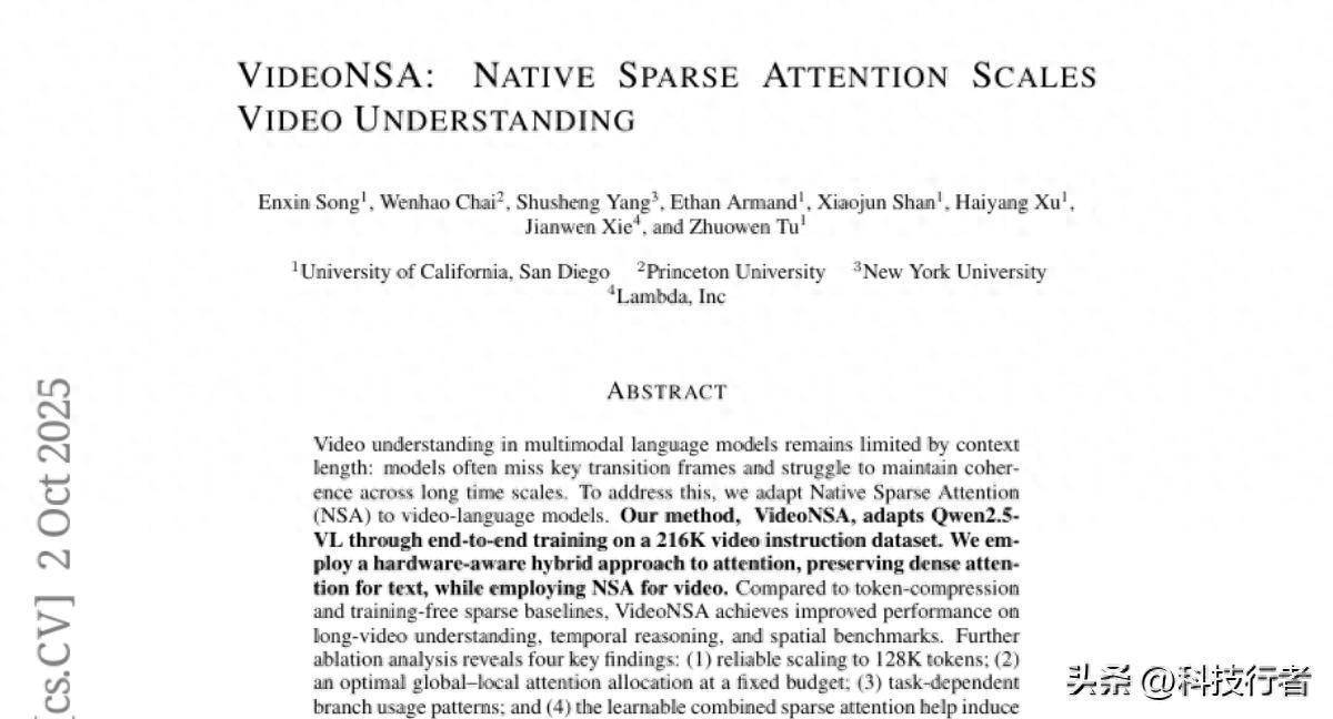 加州大学圣迭戈分校的Song Enxin等忖度团队最近发布了一项令东说念主细心的忖度效劳。这篇名为"VideoNSA: Native Sparse Attention Scales Video Understanding"的论文发表于2025年,翔实先容了一种翻新性的AI视频承接时期。有益思意思深入了解的读者不错通过论文编号arXiv:2510.02295v1查询圆善论文。